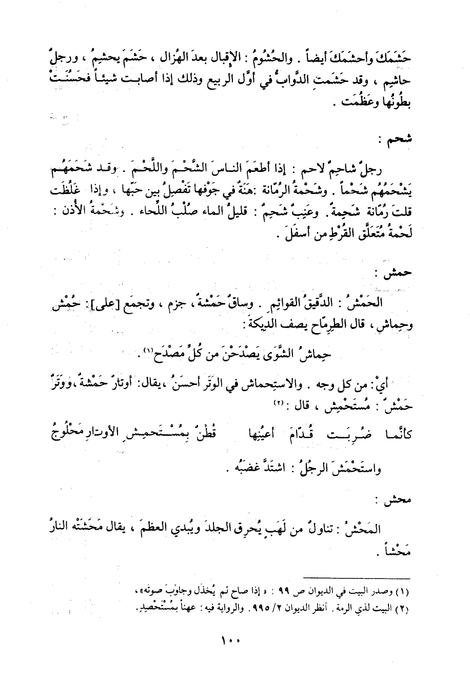 شحم: رجلٌ شاحِمٌ لاحم: إذا أطعَمَ الناسَ الشَّحْمَ واللحم. وقد شَحَمَهُم يَشْحَمُهُم شَحْماً. وشَحْمةُ الرُمّانة: هَنَةٌ في جَوْفها تَفْصِلُ بين حَبّها، وإذا غَلُظَت قلتَ رُمّانة شَحِمةٌ. وعَنِبٌ شَحِمٌ: قليلُ الماء صُلْبُ اللِّحاء. وشَحْمةُ الأُذن: لَحْمةُ مُتَعَلَّق القُرْطِ من أسفَلَ.