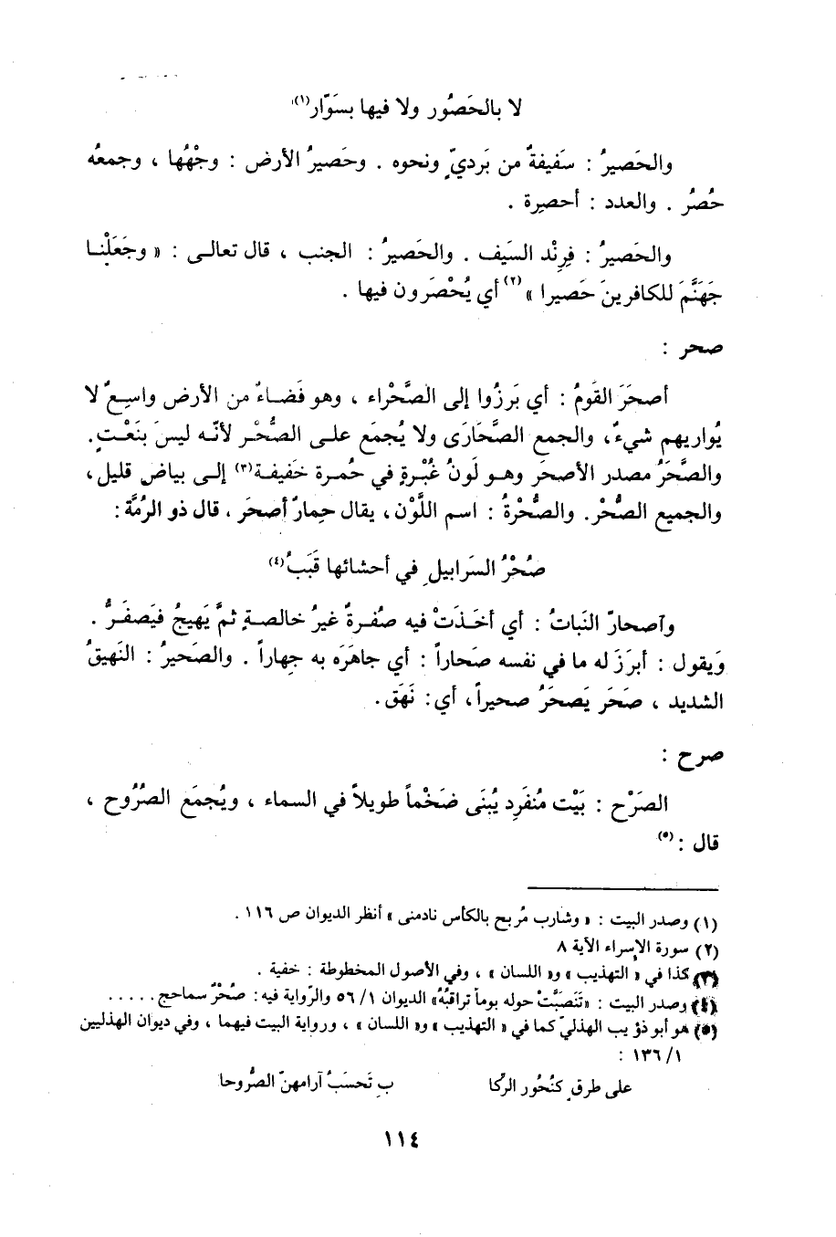 صحر: أصحَرَ القَومُ: أي بَرزُوا إلى الصَّحْراء، وهو فَضاءٌ من الأرض واسِعٌ لا يُواريهم شيءٌ، والجمع الصَّحَارَى ولا يُجمَع على الصُّحْر لأنّه ليسَ بنَعْتٍ. والصَّحَرُ مصدر الأصحَر وهو لَونُ غُبْرةٍ في حُمرة خَفيفة «3» إلى بياض قليل، والجميع الصُّحْر. والصُّحْرةُ: اسم اللَّوْن، يقال حِمارٌ أصحَر، قال ذو الرمة: