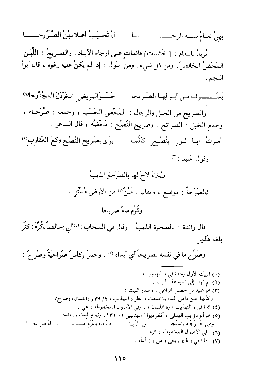 قال زائدة: بالصخرة الذيبُ. وقال في السحاب: «5» أي: خالصاً، كُرِّمَ «6» : كَثُرَ بلغة هُذيل وصَرَّح ما في نفسه تصريحا أي أبداه «7» . وخَمرٌ وكأسٌ صراحية وصراح: