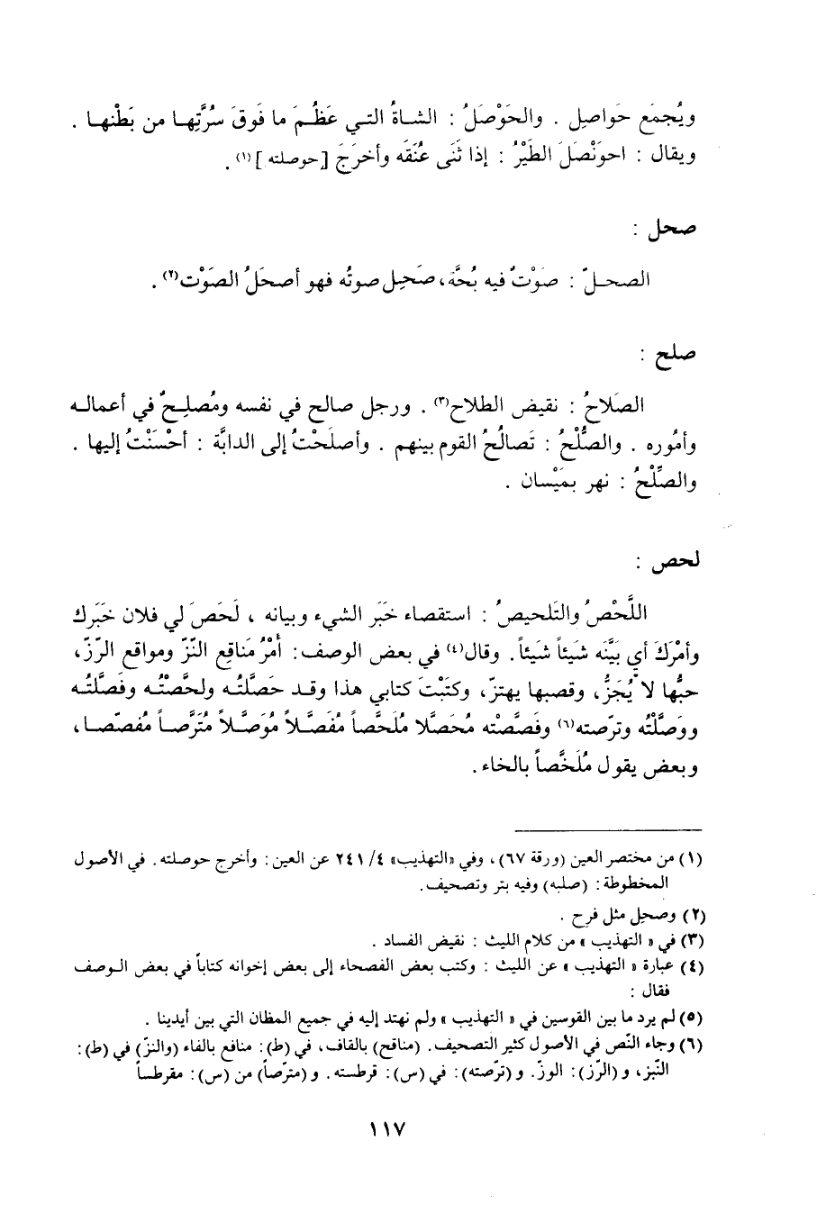 لحص: اللَّحْصُ والتَلحيصُ: استقصاء خَبَر الشيء وبيانه، لَحَصَ لي فلان خَبَرك وأمْرَكَ أي بَيَّنَه شَيئاً شَيئاً. وقال «4» في بعض الوصف: أَمْرُ مَناقِع النّزّ ومواقع الرّزّ، حبُّها لا يُجَزُّ، وقصبها يهتزّ، وكتَبْتَ كتابي هذا وقد حَصَّلتُه ولحَّصتْهُ وفَصَّلُته ووَصَّلْتُه وترّصته «6» وفَصَّصْته مُحَصَّلاً مُلَحَّصاً مُفَصَّلاً مُوَصَّلاً مُتَرَّصاً مُفصّصا، وبعض يقول ملخصا بالخاء.