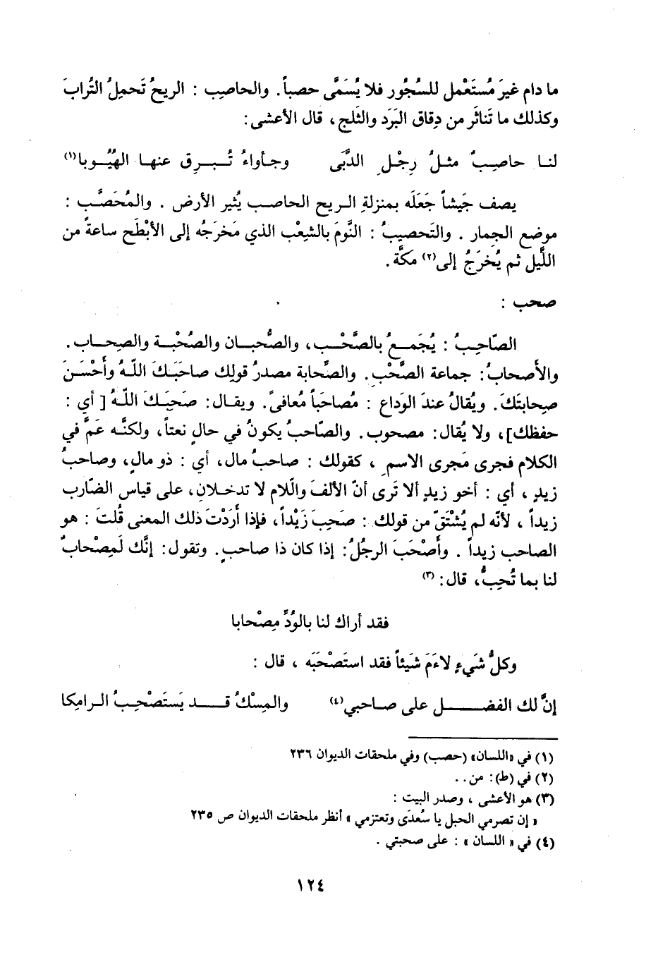صحب: الصّاحِبُ: يجمعُ بالصَّحْب، والصُّحبان والصُحْبة والصِحاب. والأَصحابُ: جماعة الصَّحْبِ. والصِّحابة مصدرُ قولِك صاحَبَكَ اللهُ وأَحْسَنَ صِحابتَكَ. ويُقالُ عندَ الوَداع: مُصاحَباً مُعافىً. ويقال: صَحِبَكَ اللهُ [أي: حفظك] ، ولا يُقال: مصحوب. والصّاحبُ يكونُ في حالٍ نعتاً، ولكنَّه عَمَّ في الكلام فجرى مَجرى الاسمِ، كقولك: صاحبُ مال، أي: ذو مالٍ، وصاحبُ زيدٍ، أي: أخو زيدٍ ألا تَرى أنّ الألفَ والّلام لا تدخلانِ، على قياس الضّارب زيداً، لأنّه لم يُشْتَقّ من قولك: صَحِبَ زَيْداً، فإذا أَرَدْتَ ذلك المعنى قُلتَ: هو الصاحب زيداً. وأَصْحَبَ الرجُلُ: إذا كان ذا صاحبٍ. وتقول: إنَّك لَمِصْحابٌ لنا بما تُحِبُّ، قال: «3»