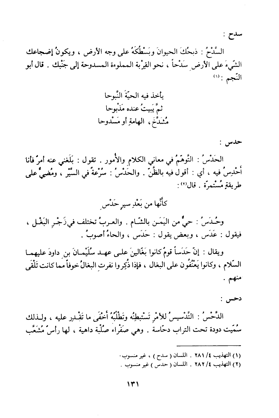 سدح: السَّدْحُ: ذبحُكَ الحيوانَ وبَسْطُكَهُ على وجه الأرض، ويكونُ إضجاعك الشّيءَ على الأرضِ سَدْحاً، نحو القِرْبة المملوءة المسدوحة إلى جَنْبك. قال أبو النجم: «1»