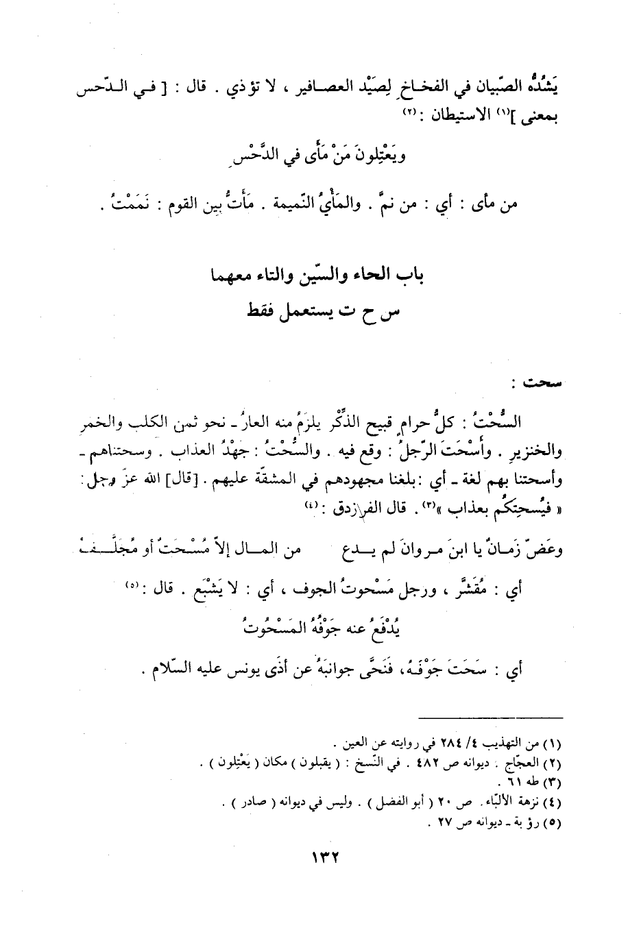 سحت: السُّحْتُ: كلُّ حرامٍ قبيح الذِّكْر يلزَمُ منه العارُ- نحو ثمن الكلب والخمرِ والخنزيرِ. وأَسْحَتَ الرّجلُ: وقع فيه. والسُّحْتُ: جَهْدُ العذاب. وسحتناهم- وأسحتنا بهم لغة- أي: بلغنا مجهودهم في المشقّة عليهم. [قال] الله عز وجل: فَيُسْحِتَكُمْ بِعَذابٍ «3» . قال الفرزدق: «4»