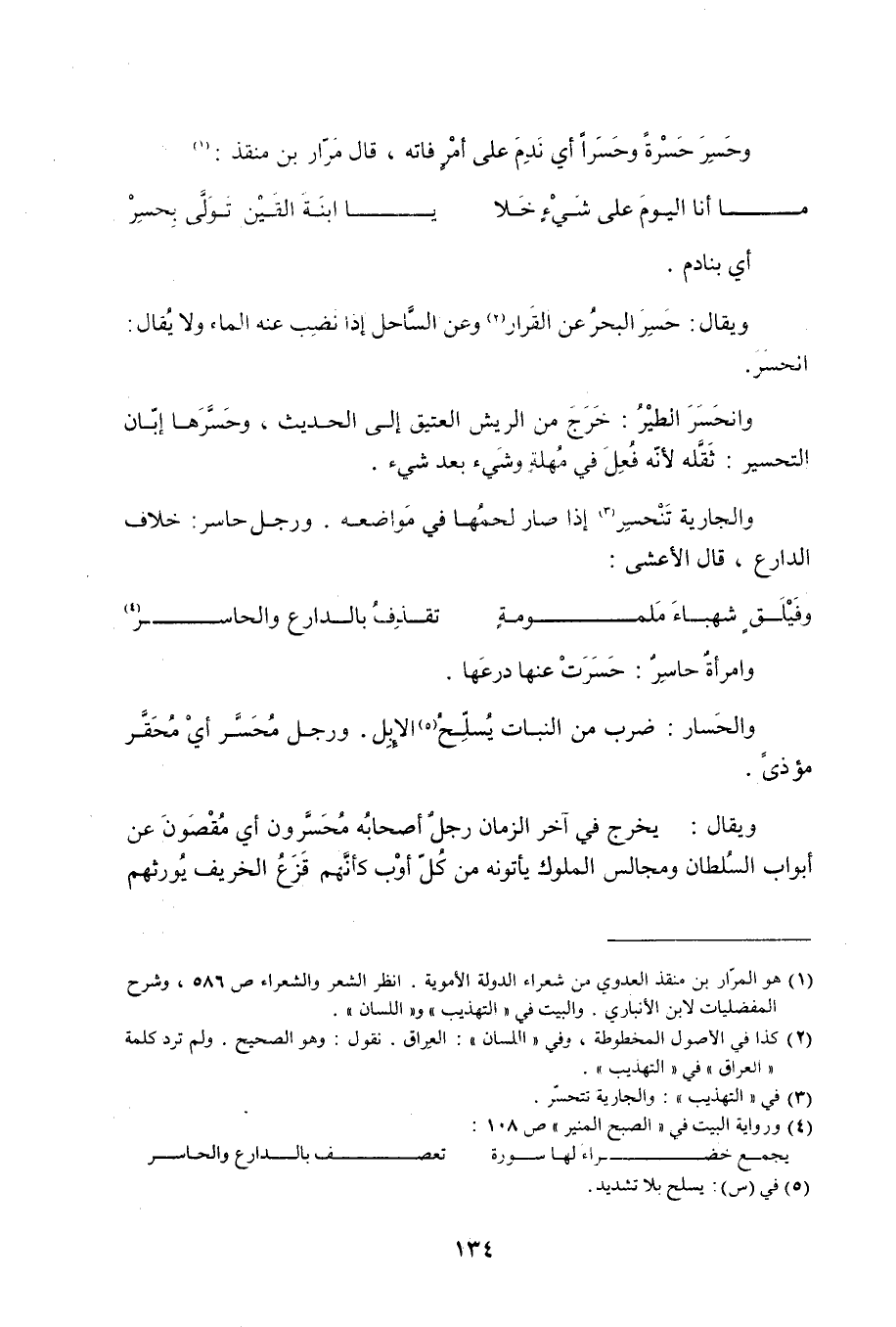 أي بنادم. ويقال: حَسِرَ البحرُ عن القرار «2» وعن السَّاحل اذا نضب عنه الماء ولا يُقال: انحسَرَ. وانحَسَرَ الطيْرُ: خَرَجَ من الريش العتيق إلى الحديث، وحَسَّرَها إبّان التحسير: ثَقَّله لأنّه فُعِلَ في مُهلةٍ وشَيء بعد شيء. والجارية تَنْحسِر «3» إذا صار لحمُها في مَواضعه. ورجل حاسر: خلاف الدارع، قال الأعشى:
