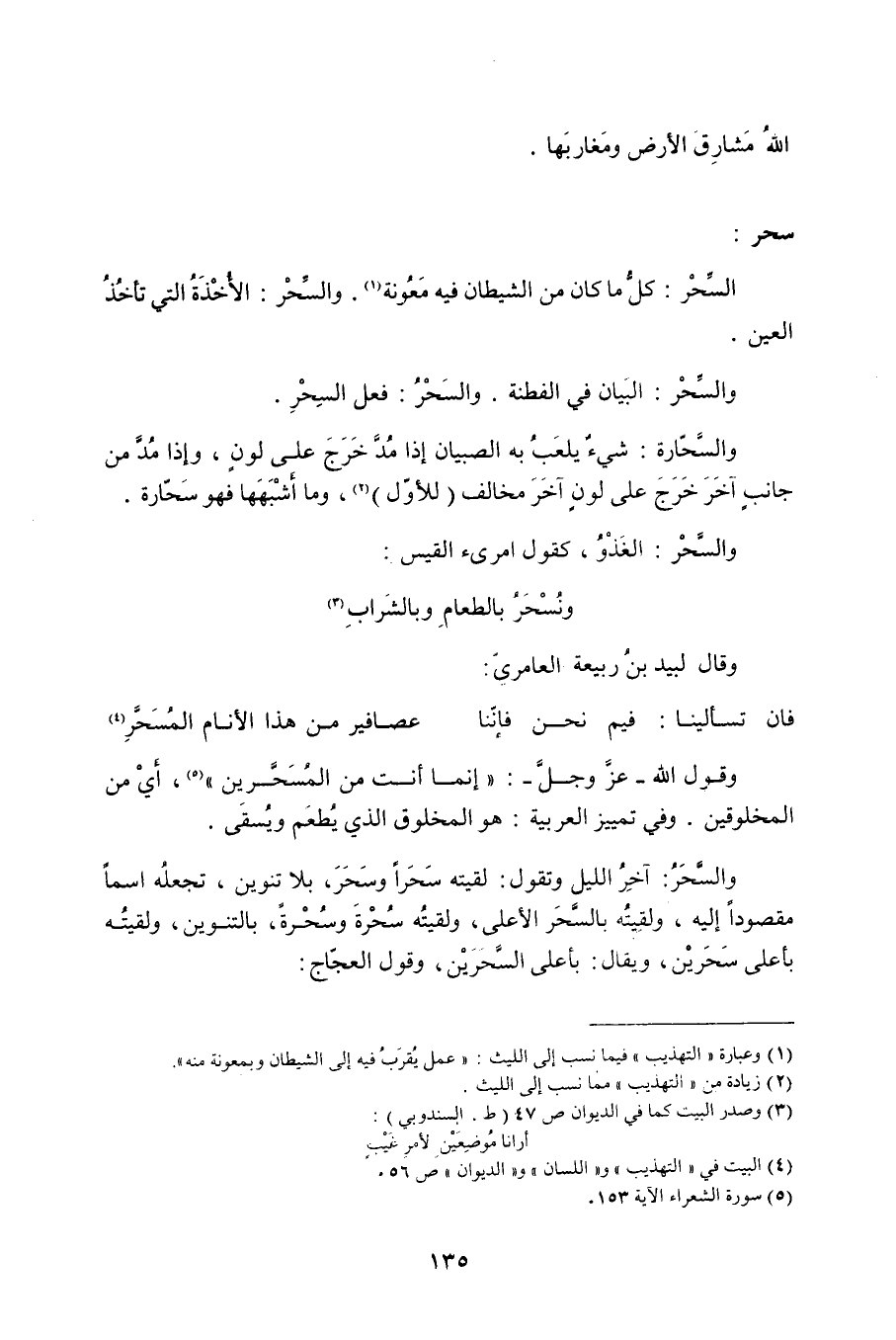 «5» ، أيْ من المخلوقين. وفي تمييز العربية: هو المخلوق الذي يُطعَم ويُسقَى. والسَّحَرُ: آخِرُ الليل وتقول: لقيته سَحَراً وسَحَرَ، بلا تنوين، تجعله اسماً مقصوداً إليه، ولقِيتُه بالسَّحَر الأعلى، ولقيتُه سُحْرةَ وسُحْرةً بالتنوين، ولقيتُه بأعلى سَحَريْن، ويقال: بأعلى السَّحَرَيْن، وقول العجاج: