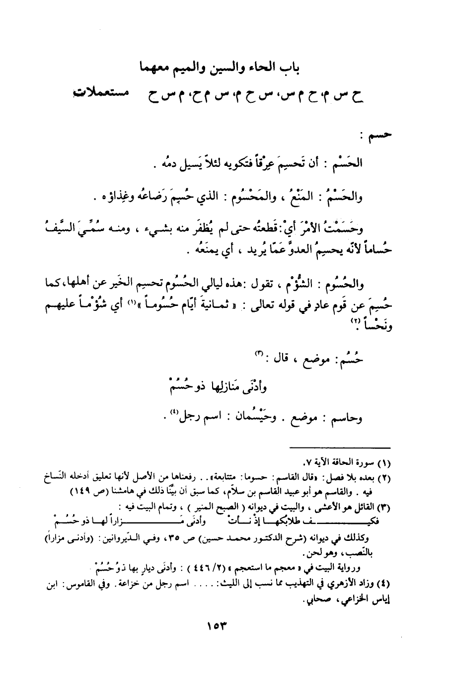 (3) بعده بلا فصل: قال القاسم: حسوما: متتابعة. رفعناها من الأصل لأنها تعليق أدخله النساخ فيه. والقاسم هو أبو عبيد القاسم بن سلام، كما سبق أن بينا ذلك في هامشنا (ص 149)