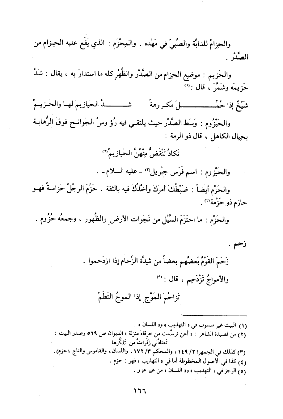 والحِزامُ للدابَّة والصبَّيّ في مَهْده. والمِحْزَم: الذي يَقَع عليه الحِزام من الصَّدْر. والحَزيم: موضِع الحزِام من الصَّدْر والظَّهْرِ كله ما استدارَ به، يقال: شَدَّ حَزيمَه وشَمَّرَ، قال: «1»