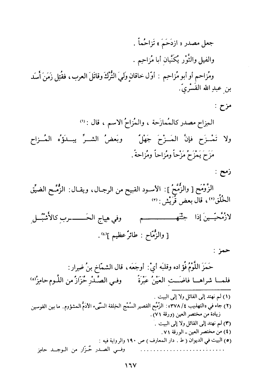 (2) جاء في التهذيب 4/ 378: الزمح القصير السمج الخلقة السيىء الأدم المشئوم. ما بين القوسين زيادة من مختصر العين (ورقة 71) .