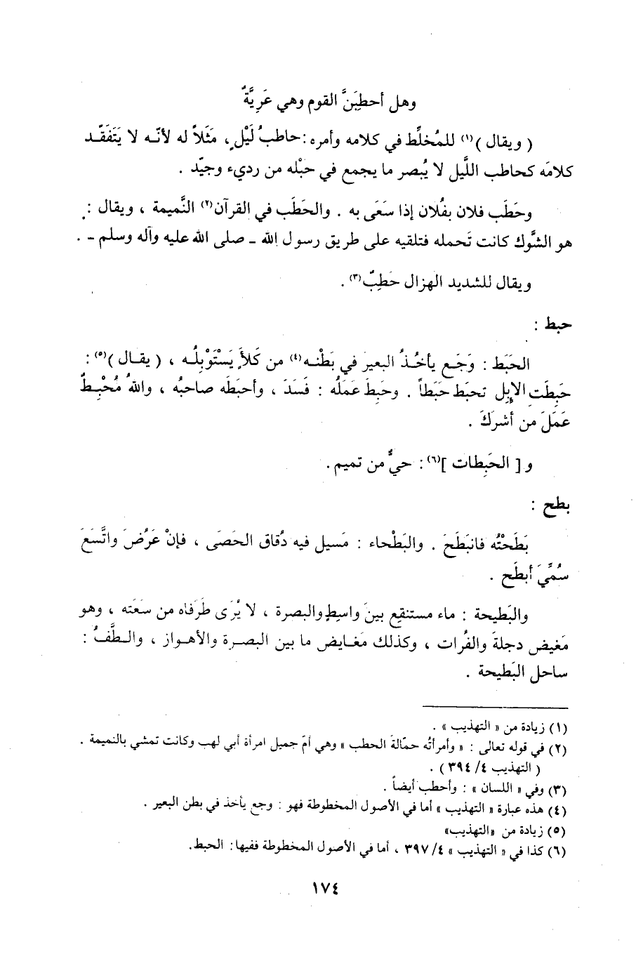 (ويقال) «1» للمُخلِّط في كلامه وأمره: حاطبُ لَيْلٍ، مَثَلاً له لأنّه لا يَتَفَقّد كلامَه كحاطب اللَّيل لا يُبصر ما يجمع في حَبْله من رديء وجيّد. وحَطَب فلان بفُلان إذا سَعَى به. والحَطَب في القرآن «2» النَّميمة، ويقال: هو الشَّوك كانت تَحمله فتلقيه على طريق رسول الله صلى الله عليه وآله وسلم-. ويقال للشديد الهزال حَطِبٌ «3» .
