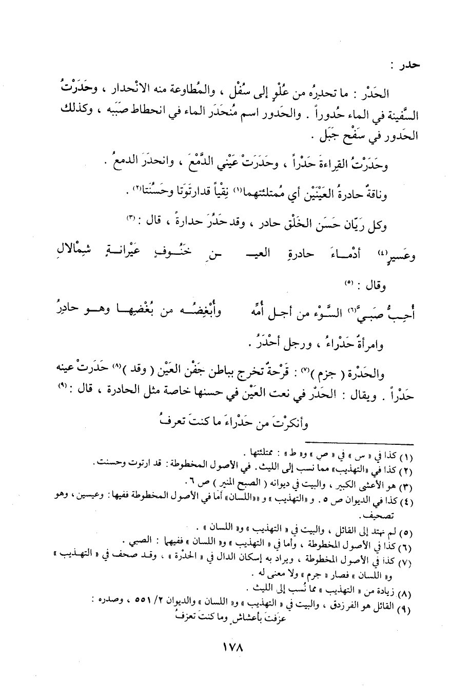 (7) كذا في الأصول المخطوطة، ويراد به إسكان الدال في الحدرة، وقد صحف في التهذيب واللسان فصار جرم ولا معنى له.