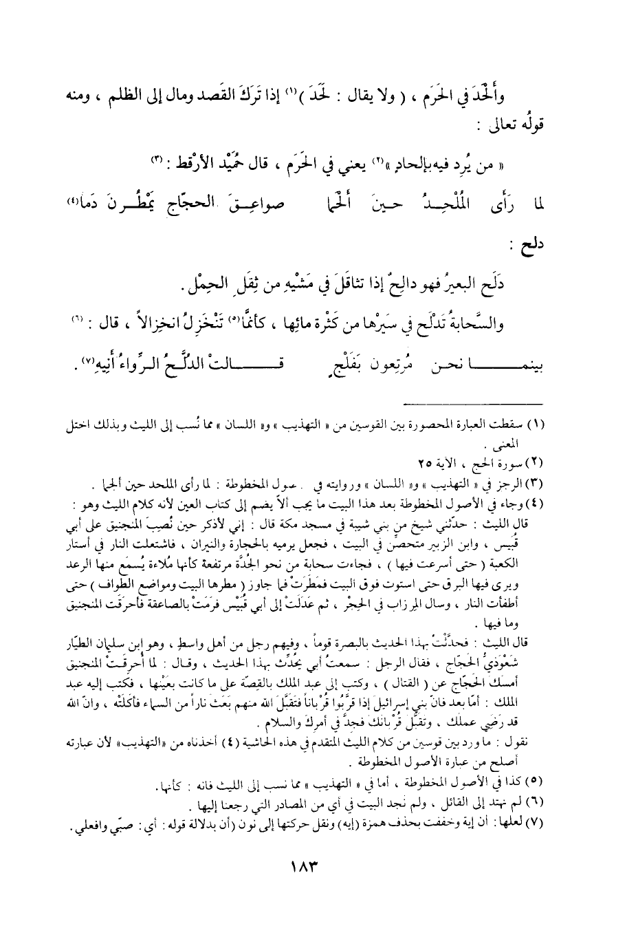 (4) وجاء في الأصول المخطوطة بعد هذا البيت ما يجب ألا يضم إلى كتاب العين لأنه كلام الليث وهو: قال الليث: حدثني شيخ من بني شيبة في مسجد مكة قال: إني لأذكر حين نصب المنجنيق على أبي قبيس، وابن الزبير متحصن في البيت، فجعل يرميه بالحجارة والنيران، فاشتعلت النار في أستار الكعبة (حتى أسرعت فيها) ، فجاءت سحابة من نحو الجدة مرتفعة كأنها ملاءة يسمع منها الرعد ويرى فيها البرق حتى استوت فوق البيت فمطرت فما جاوز (مطرها البيت ومواضع الطواف) حتى أطفأت النار، وسال المرزاب في الحجر، ثم عدلت إلى أبي قبيس فرمت بالصاعقة فأحرقت المنجنيق وما فيها. قال الليث: فحدثت بهذا الحديث بالبصرة قوما، وفيهم رجل من أهل واسط، وهو ابن سليمان الطيار شعوذي الحجاج، فقال الرجل: سمعت أبي يحدث بهذا الحديث، وقال: لما أحرقت المنجنيق أمسك الحجاج عن (القتال) ، وكتب إلى عبد الملك بالقصة على ما كانت بعينها، فكتب إليه عبد الملك: أما بعد فإن بني إسرائيل إذا قربوا قربانا فتقبل الله منهم بعث نارا من السماء فأكلته، وإن الله قد رضي عملك، وتقبل قربانك فجد في أمرك والسلام. نقول: ما ورد بين قوسين من كلام الليث المتقدم في هذه الحاشية (4) أخذناه من التهذيب لأن عبارته أصلح من عبارة الأصول المخطوطة.