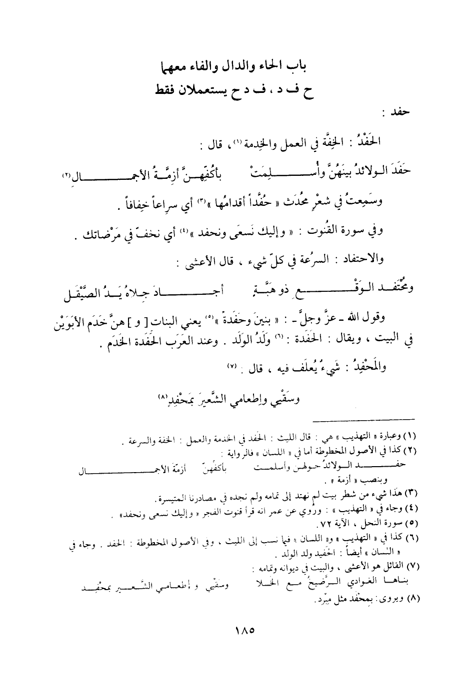 (6) كذا في التهذيب واللسان فيما نسب إلى الليث، وفي الأصول المخطوطة: الحفد. وجاء في اللسان أيضا. الحفيد ولد الولد.