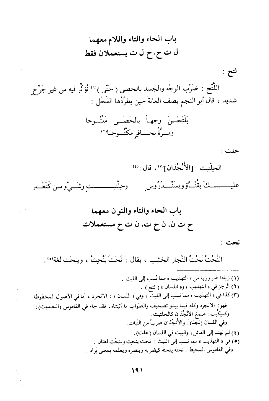 باب الحاء والتاء والنون معهما ح ت ن، ن ح ت، ن ت ح مستعملات