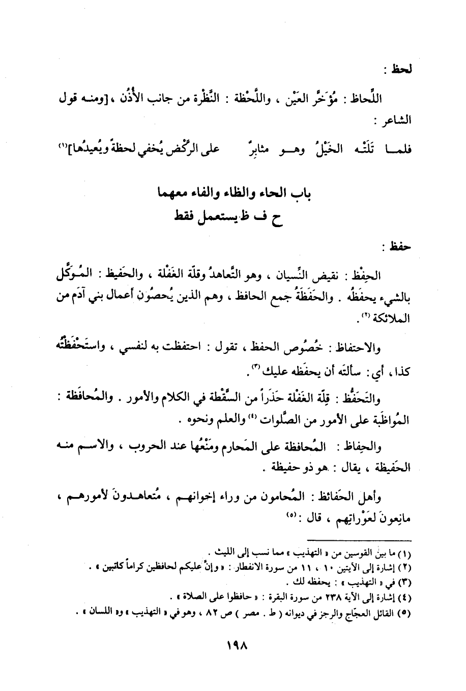 حفظ: الحِفْظ: نقيض النِّسيان، وهو التَّعاهدُ وقلّة الغَفْلة، والحَفيظ: المُوَكَّل بالشيء يحفَظْه. والحَفَظَةُ جمع الحافظ، وهم الذين يُحصُون أعمال بني آدَم من الملائكة «2» . والاحتفاظ: خُصُوص الحفظ، تقول: احتفظت به لنفسي، واستَحْفَظْتُه كذا، أي: سألته أن يحفَظه عليك «3» . والتَحَفُّظ: قِلّة الغَفْلة حَذَراً من السَّقْطة في الكلام والأمور. والمُحافَظة: المُواظَبة على الأمور من الصَّلوات «4» والعلم ونحوه. والحِفاظ: المُحافظة على المَحارم ومَنْعُها عند الحروب، والاسم منه الحَفيظة، يقال: هو ذو حفيظة. وأهل الحَفائظ: المُحامون من وراء إخوانهم، مُتعاهدونَ لأمورهم، مانِعونَ لعَوْراتِهم، قال: «5»
