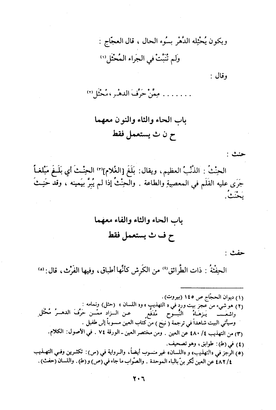 (5) الرجز في التهذيب واللسان غير منسوب أيضا، والرواية في (س) : تكثرين وفي التهذيب 4/ 482 عن العين تكربن بالباء الموحدة. والصواب ما جاء في (ص) و (ط) . واللسان (حفث) .
