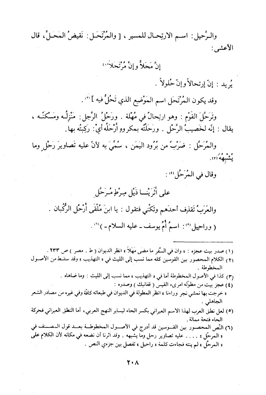 (6) النص المحصور بين القوسين قد أدرج في الأصول المخطوطة بعد قول المصنف في المرحل:.... عليه تصاوير رحل وما يشبهه. وقد آثرنا أن نضعه في مكانه لأن الكلام على المرحل لم ينته فجاءت كلمة راحيل تفصل بين جزأي النص.