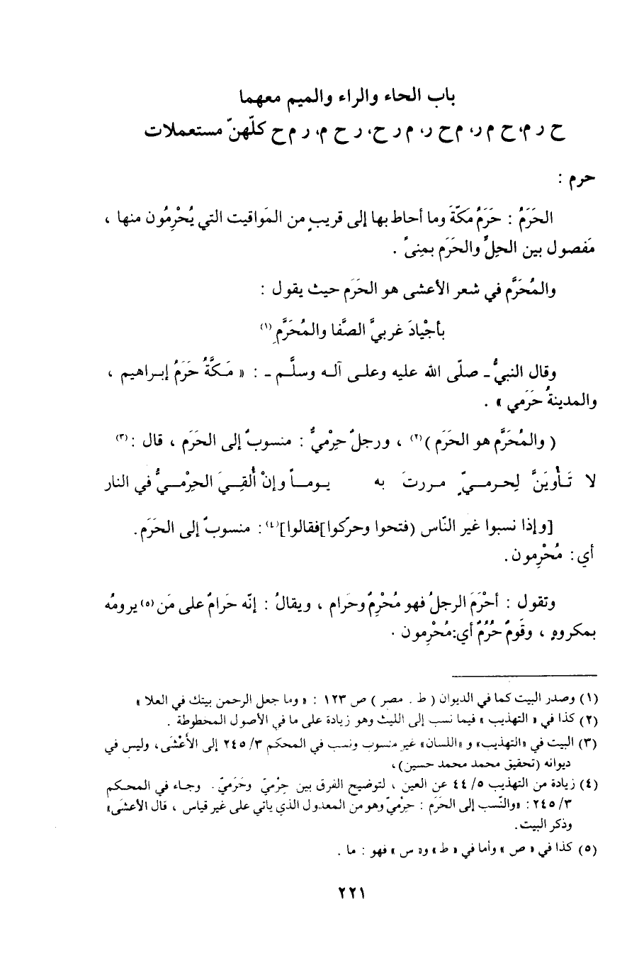 (4) زيادة من التهذيب 5/ 44 عن العين، لتوضيح الفرق بين حرمي وحرمي. وجاء في المحكم 3/ 245: والنسب إلى الحرم: حرمي وهو من المعدول الذي يأتي على غير قياس، قال (الأعشى) وذكر البيت.