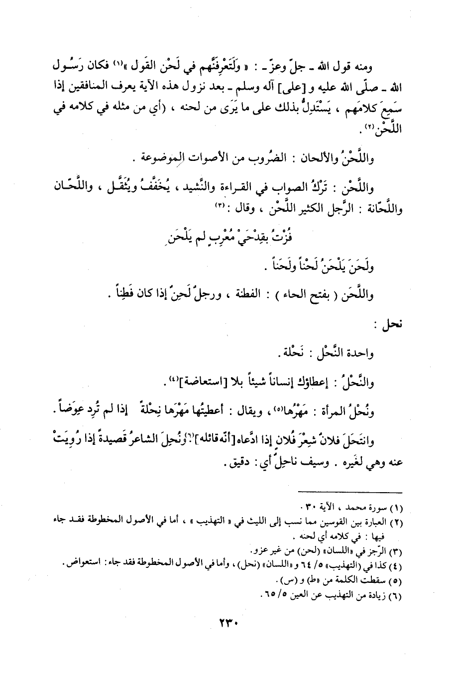 (2) العبارة بين القوسين مما نسب إلى الليث في التهذيب، أما في الأصول المخطوطة فقد جاء فيها: في كلامه أي لحنه.