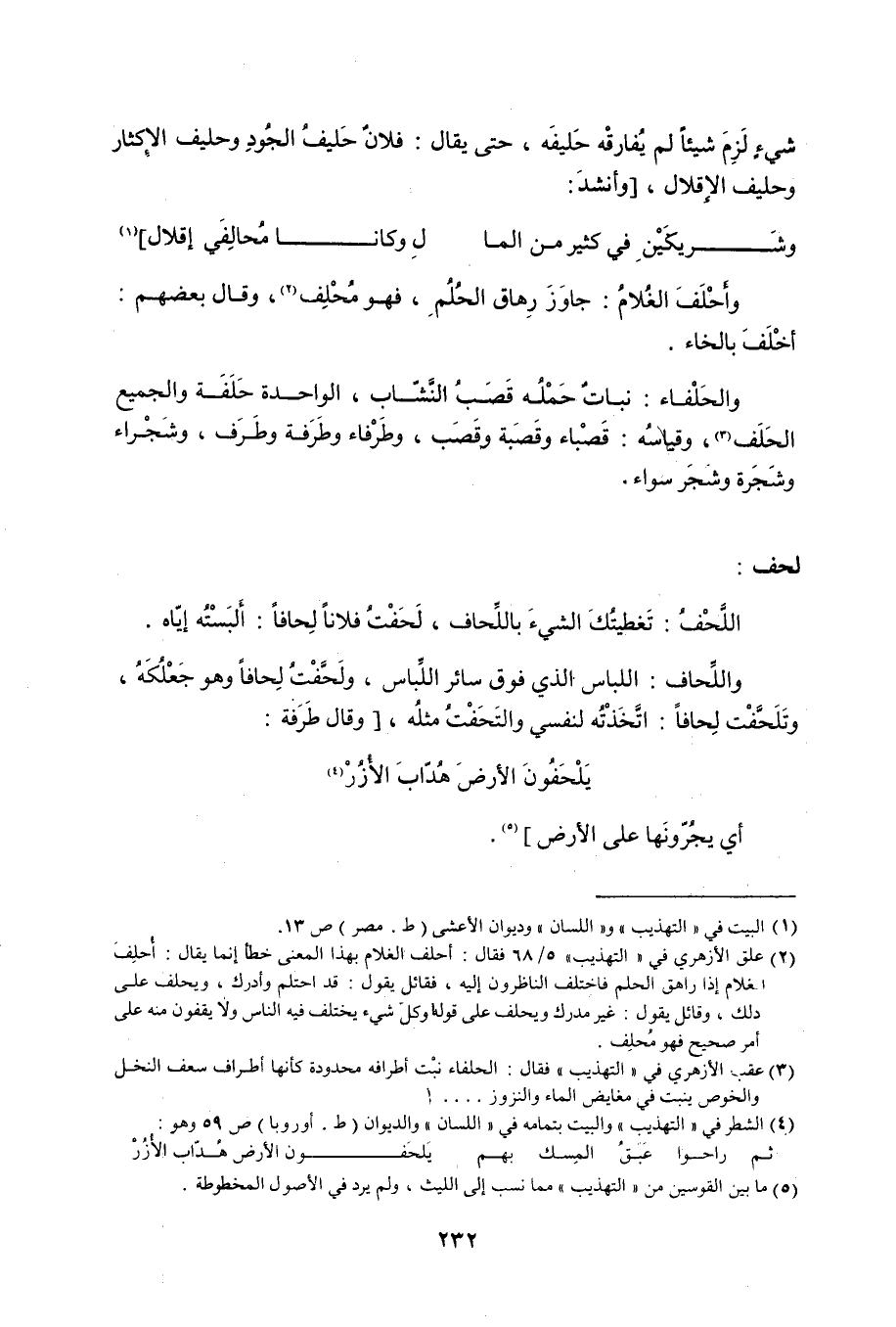 (2) علق الأزهري في التهذيب 5/ 68 فقال: أحلف الغلام بهذا المعنى خطأ إنما يقال: أحلف الغلام إذا راهق الحلم فاختلف الناظرون إليه، فقائل يقول: قد احتلم وأدرك، ويحلف على ذلك، وقائل يقول: غير مدرك ويحلف على قوله وكل شيء يختلف فيه الناس ولا يقفون منه على أمر صحيح فهومحلف.