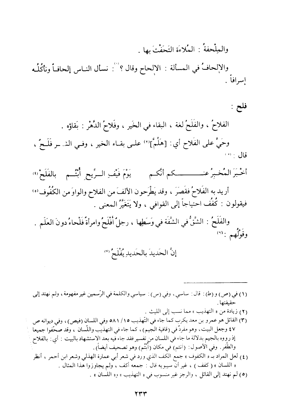 أريد به الفَلاحُ فقَصَرَ، وقد يَطْرَحون الألفَ من الفلاح والواوَ من الكُفُوف «4» فيقولون: كُفُف احتياجاً إلى القوافي، ولا يَتَغَيَّرُ المعنى. والفَلَحُ: الشَّقُّ في الشَّفَة في وَسَطِها، رجلٌ أَفْلَحُ وامرأةٌ فَلْحاءُ دونَ العَلَم. وقَوْلهُم: «5»