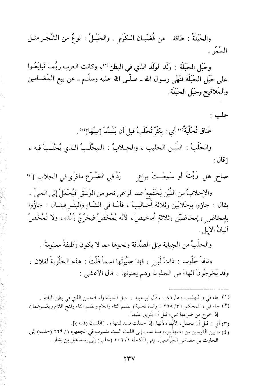 (4) ما بين القوسين من التهذيب مما نسب إلى الليث البيت منسوب في الجمهرة 1/ 229 (حلب) إلى (الحارث بن مضاض الجرهمي) ، وفي التكملة 1/ 106 (حلب) إلى (إسماعيل بن بشار) .