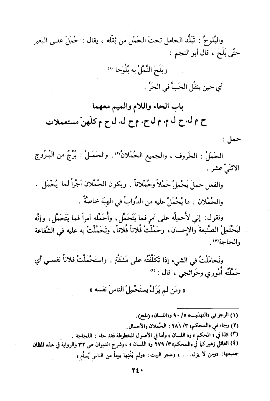 باب الحاء واللام والميم معهما ح م ل، ح ل م، م ل ح، م ح ل، ل ح م كلهن مستعملات