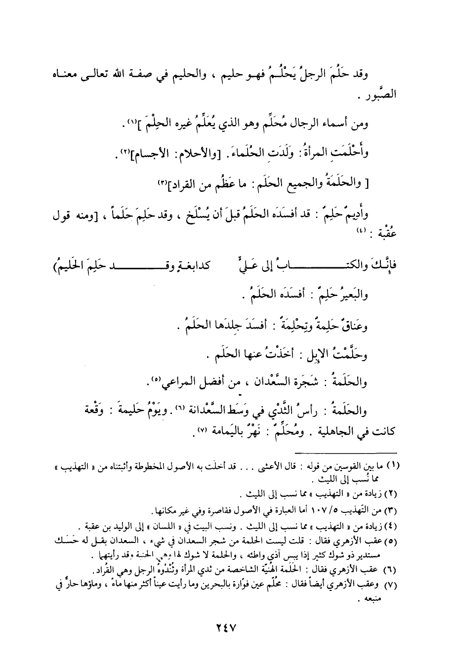 (7) وعقب الأزهري أيضا فقال: محلم عين فوارة بالبحرين وما رأيت عينا أكثر منها ماء، وماؤها حار في منبعه.