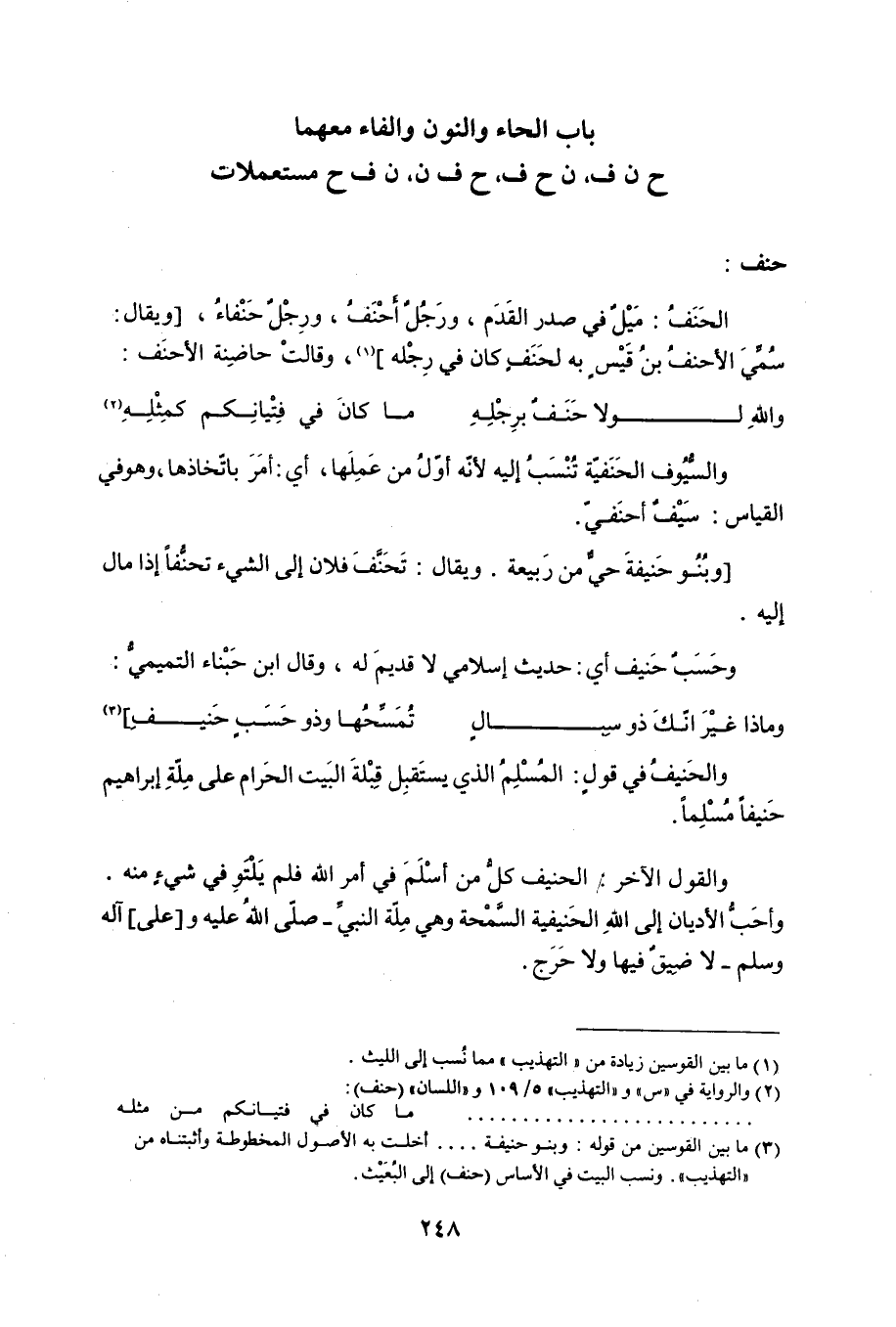 حنف: الحَنَفُ: مَيْلٌ في صدر القَدَم، ورجلٌ أَحْنَفُ، ورِجْلٌ حَنْفاءُ، [ويقال: سُمِّيَ الأحنفُ بنُ قَيْسٍ به لحَنَفٍ كان في رِجْله] «1» ، وقالتْ حاضِنة الأحنَف: