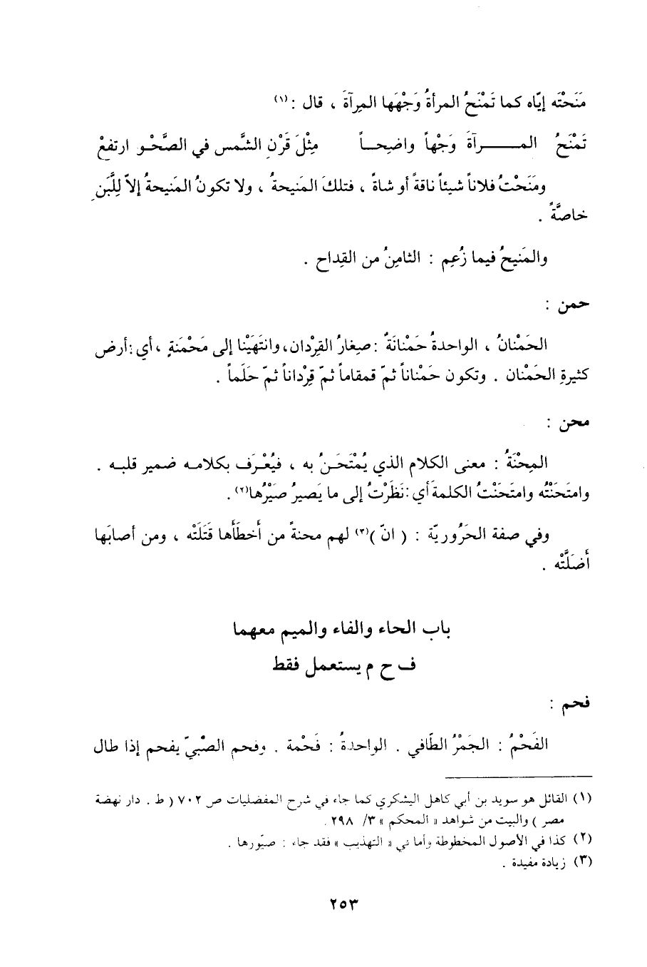 محن: المِحْنَةُ: معنى الكلام الذي يُمْتَحَنُ به، فيُعرف بكلامه ضمير قلبه. وامتَحَنْتُه وامتَحَنْتُ الكلمة أي: نَظَرْتُ إلى ما يَصيرُ صَيْرُها «2» . وفي صفة الحَرُوريّة: (إنَّ) «3» لهم محنةً من أَخطَأَها قَتَلَتْه، ومن أصابَها أَضَلَّتْه.
