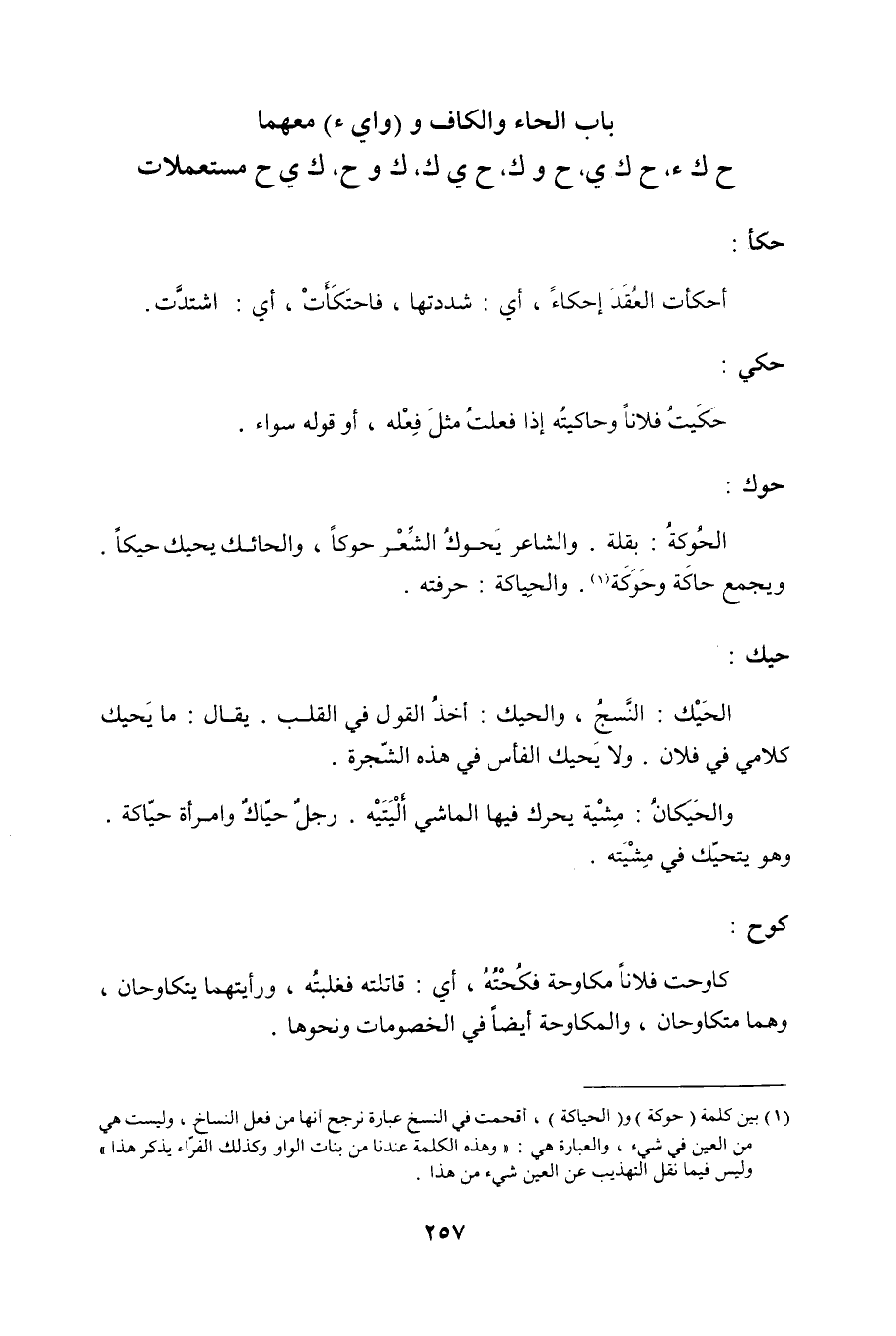 (1) بين كلمة (حوكة) و (الحياكة) ، أقحمت في النسخ عبارة نرجح أنها من فعل النساخ، وليست هي من العين في شيء، والعبارة هي: وهذه الكلمة عندنا من بنات الواو وكذلك الفراء يذكر هذا وليس فيما نقل التهذيب عن العين شيء من هذا.