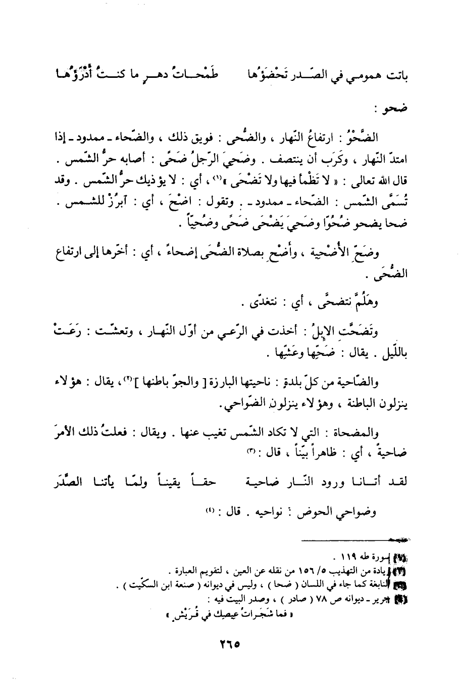 «1» ، أي: لا يؤذيك حرُّ الشّمس. وقد تُسَمَّى الشّمس: الضّحاء- ممدود-. وتقول: اضْحَ، أي: ابرُزْ للشمس. ضحا يضحو ضُحُوّا وضَحِيَ يَضْحَى ضَحًى وضُحِيّاً. وضَحِّ الأُضْحِية، وأَضْحِ بصلاة الضُّحَى إضحاءً، أي: أخّرها إلى ارتفاع الضُّحَى. وهَلُمَّ نتضحَى، أي: نتغدّى. وتَضَحَّتِ الإبِلُ: أخذت في الرّعي من أوّل النّهار، وتعشّت: رَعَتْ باللّيل. يقال: ضَحْها وعَشِها. والضّاحية من كلّ بلدةٍ: ناحيتها البارزة [والجوّ باطنها] «2» ، يقال: هؤلاء ينزلون الباطنة، وهؤلاء ينزلون الضّواحي. والمضحاة: التي لا تكاد الشّمس تغيب عنها. ويقال: فعلتُ ذلك الأمرَ ضاحيةً، أي: ظاهراً بيّناً، قال: «3»