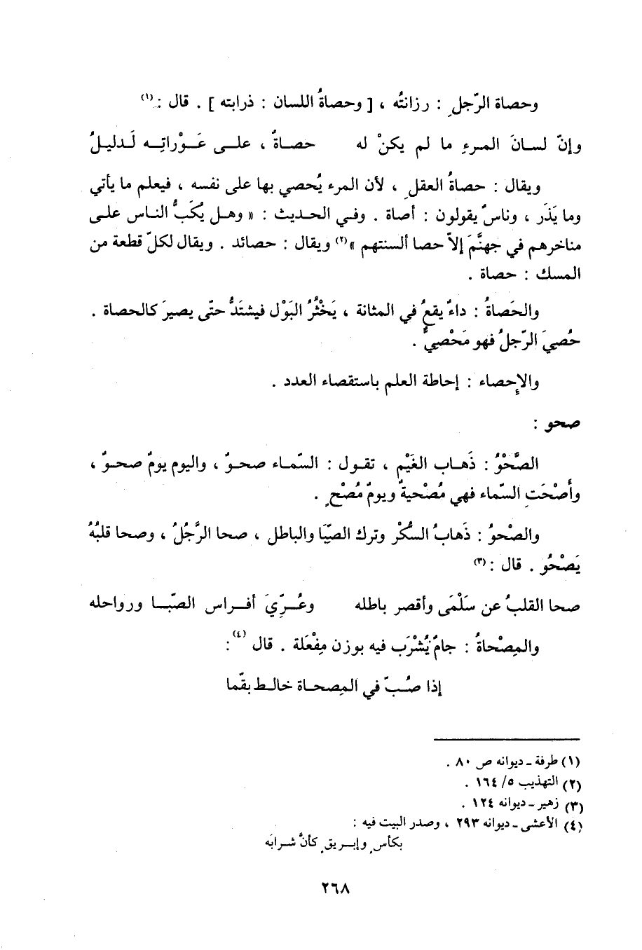 صحو: الصَّحْوُ: ذَهاب الغَيْم، تقول: السّماء صحوٌ، واليوم يومٌ صحوٌ، وأَصْحَتِ السّماء فهي مُصْحيةٌ ويومٌ مُصْحٍ. والصْحوُ: ذَهابُ السُّكْر وترك الصِبّاَ والباطل، صحا الرَّجُلُ، وصحا قلبُهُ يَصْحُو. قال: «3»