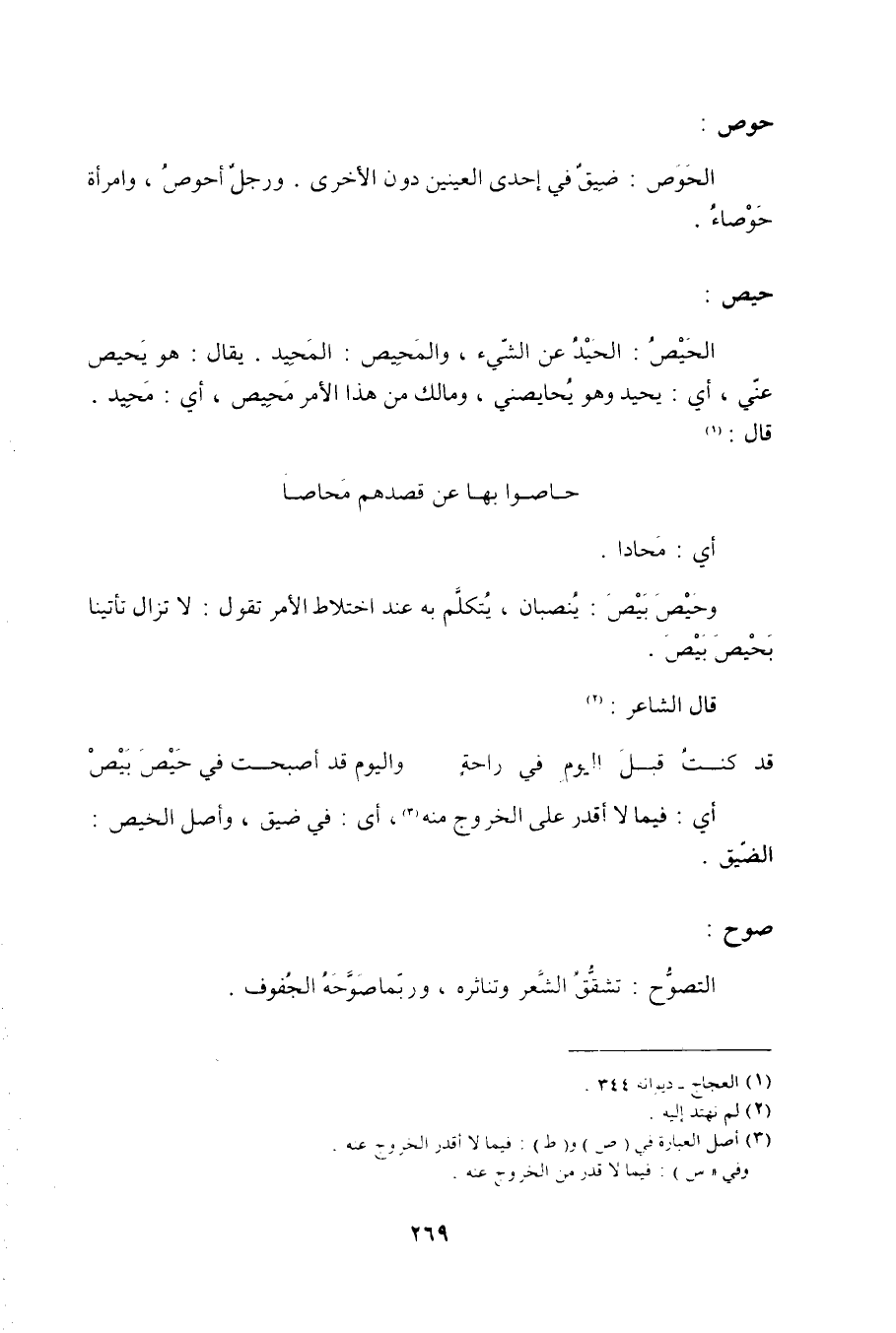 أي: مَحادا. وحَيْصَ بَيْصَ: يُنصبان، يُتكلَّم به عند اختلاط الأمر تقول: لا تزال تأتينا بَحْيصَ بَيْصَ. قال الشاعر:»