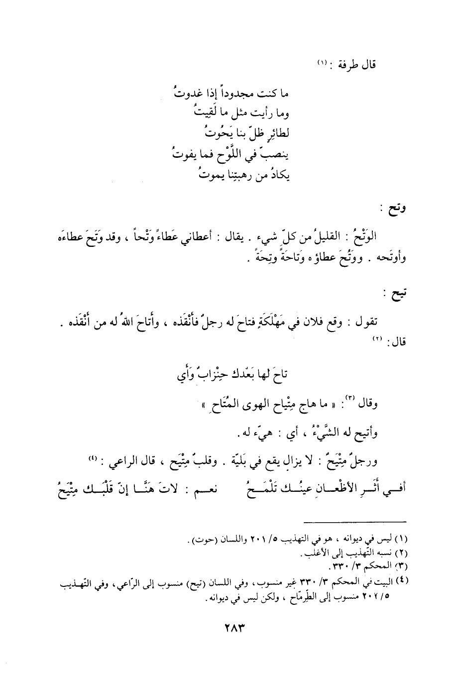 (4) البيت في المحكم 3/ 330 غير منسوب، وفي اللسان (تيح) منسوب إلى (الراعي) ، وفي التهذيب 5/ 202 منسوب إلى (الطرماح) ، ولكن ليس في ديوانه.
