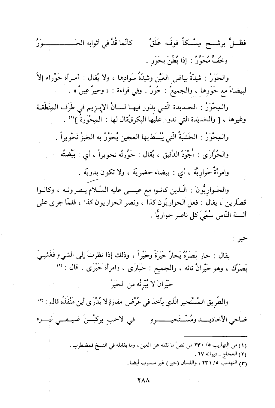 حير: يقال: حار بَصَرُهُ يَحارُ حَيْرَةً وحَيِراً، وذلك إذا نظرتَ إلى الشيءِ فَغَشِيَ بَصَرُك، وهو حَيْرانُ تائه، والجميع: حَيَارَى، وامرأة حَيْرَى. قال: «2»