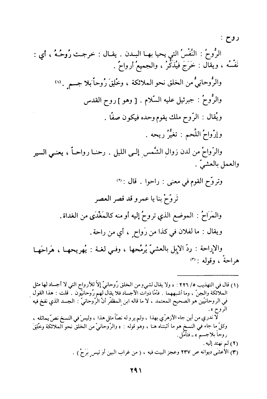 (1) قال في التهذيب 5/ 226: ولا يقال لشيء من الخلق روحاني إلا للأرواح التي لا أجساد لها مثل الملائكة والجن، وما أشبههما. فأما ذوات الأجساد فلا يقال لهم روحانيون. قلت: هذا القول في الروحانيين هو الصحيح المعتمد، لا ما قاله ابن المظفر أن الروحاني: الجسد الذي نفخ فيه الروح. لا ندري من أين جاء الأزهري بهذا، ولم يرو له نصا مثل هذا، وليس في النسخ نص يماثله، وكل ما جاء في النسخ هو ما أثبتناه هنا، وهو قوله: والرُّوحانِيُّ من الخلق نحو الملائكة وخُلِقَ رُوحاً بلا جسم- فتأمل.