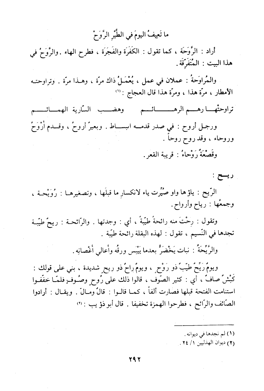 ريح: الرّيح: ياؤها واو صُيِّرت ياء لانكسارِ ما قبلَها، وتصغيرها: رُوَيْحة، وجمعُها: رياح وأرواح. وتقول: رِحْتَ منه رائحةً طيّبةً، أي: وجدتها. والرّائحة: ريحٌ طيّبة تجدها في النّسيم، تقول: لهذه البقلة رائحة طيّبة. والريحة: نبات يخضر بعد ما يَيْبَس ورقُه وأَعالي أَغْصانِه. ويومٌ رَيِّحٌ طيّبٌ ذو رَوْحٍ، ويومٌ راحٌ ذو ريح شديدة، بني على قولك: كَبْشٌ صافٌ، أي: كثير الصّوف، قالوا ذلك على رُوحِ وصُوفٍ فلمّا خفّفوا استنامت الفتحة قبلها فصارت ألفاً، كما قالوا: قالٌ ومالٌ. ويقال: أرادوا الصّائف والرّائح، فطرحوا الهمزة تخفيفا. قال أبو ذؤيب: «2»