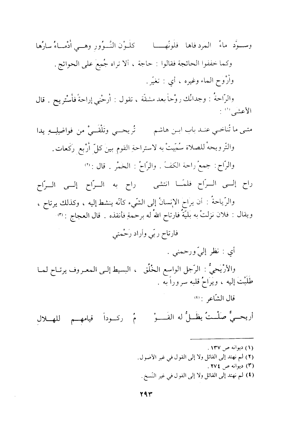 والتّرويحهْ للصلاة سُمّيِتَ ْبه لاستراحةِ القومِ بينَ كلّ أَرْبِع رَكَعات. والرّاح: جمعُ راحة الكفّ. والرّاحُ: الخَمْر. قال: «2»