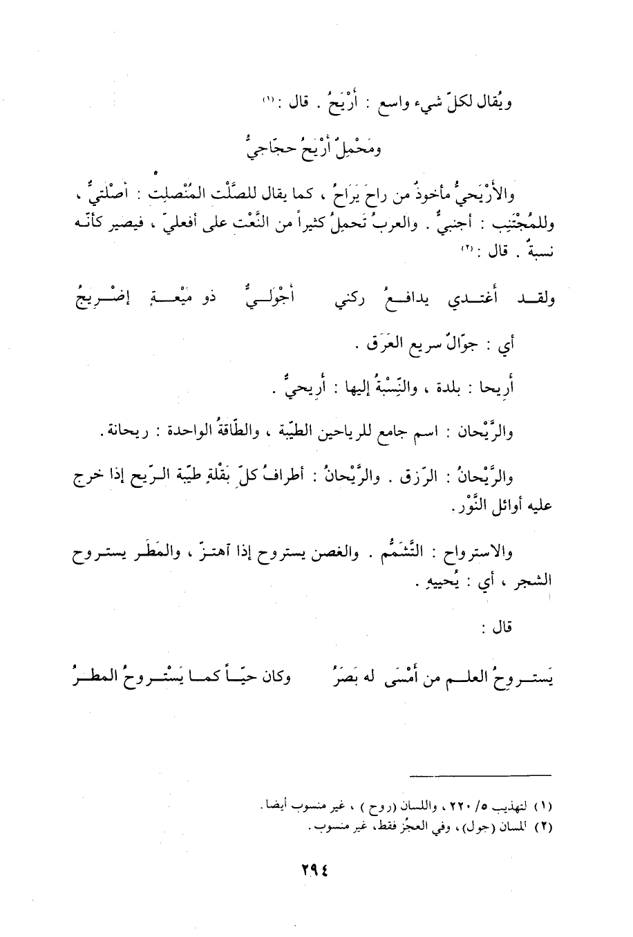 أي: جوّالٌ سريع العَرَق. أَرِيحا: بلدة، والنّسِبْةُ إليها: أَرِيحيٌّ. والرَّيْحان: اسم جامع للرياحين الطيّبة، والطّاقةُ الواحدة: ريحانة. والرَّيْحانُ: الرّزق. والرَّيْحانُ: أطرافُ كلّ بَقْلةٍ طيّبة الرّيح إذا خرج عليه أوائل النَّوْر. والاسترواح: التَّشَمُّم. والغصن يستروح إذا آهتزّ، والمَطَر يستروح الشجر، أي: يُحييِه. قال: