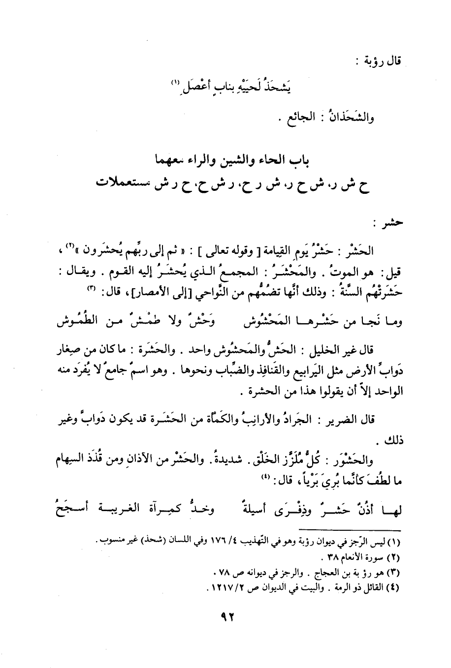 باب الحاء والشين والراء معهما ح ش ر، ش ح ر، ش ر ح، ر ش ح، ح ر ش مستعملات