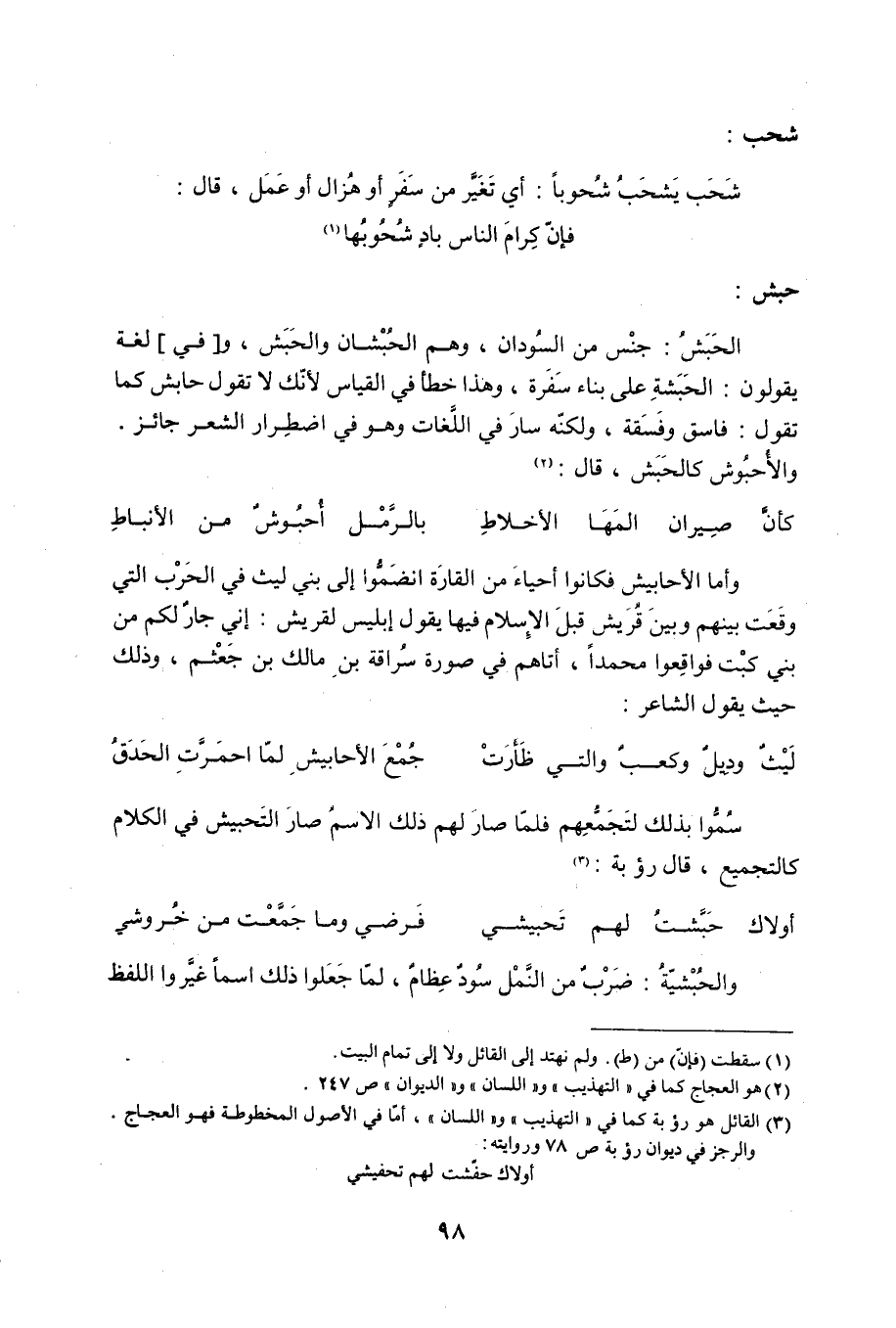 حبش: الحَبَشُ: جنْس من السُودان، وهم الحبشان والحبش، و [في] لغة يقولون: الحَبَشِة على بناء سَفَرة، وهذا خطأ في القياس لأنّك لا تقول حابش كما تقول: فاسق وفَسَقة، ولكنّه سارَ في اللَّغات وهو في اضطِرار الشعر جائز. والأُحُبوش كالحَبَش، قال: «2»