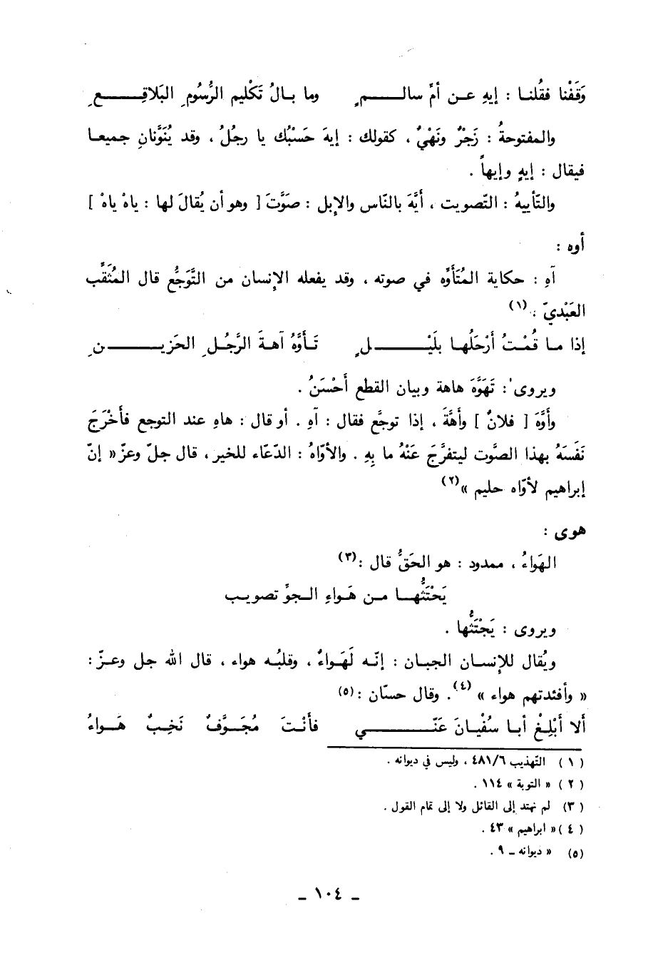 ويروى: تَهَوَّهَ هاهة وبيان القطع أَحْسَنُ. وأَوَّهَ [فلانٌ] وأَهَّةَ، إذا توجَّع فقال: آهِ. أو قال: هاهِ عند التوجع فأَخْرَجَ نَفَسَهُُ بهذا الصَّوت ليتفرَّجَ عَنْهُ ما بِهِ. والأوّاهُ: الدّعّاء للخير، قال جلّ وعزّ إِنَّ إِبْراهِيمَ لَأَوَّاهٌ حَلِيمٌ «2»