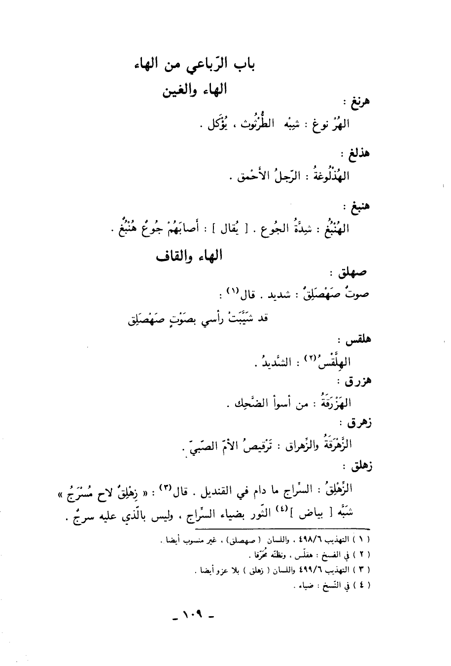 زهلق: الزَّهْلِقُ: السِّراج ما دام في القنديل. قال «3» : زِهْلِقٌ لاح مُسْرَجُ شَبَّه [بياض] «4» الثّور بضياء السَّراج، وليس بالّذي عليه سرج.