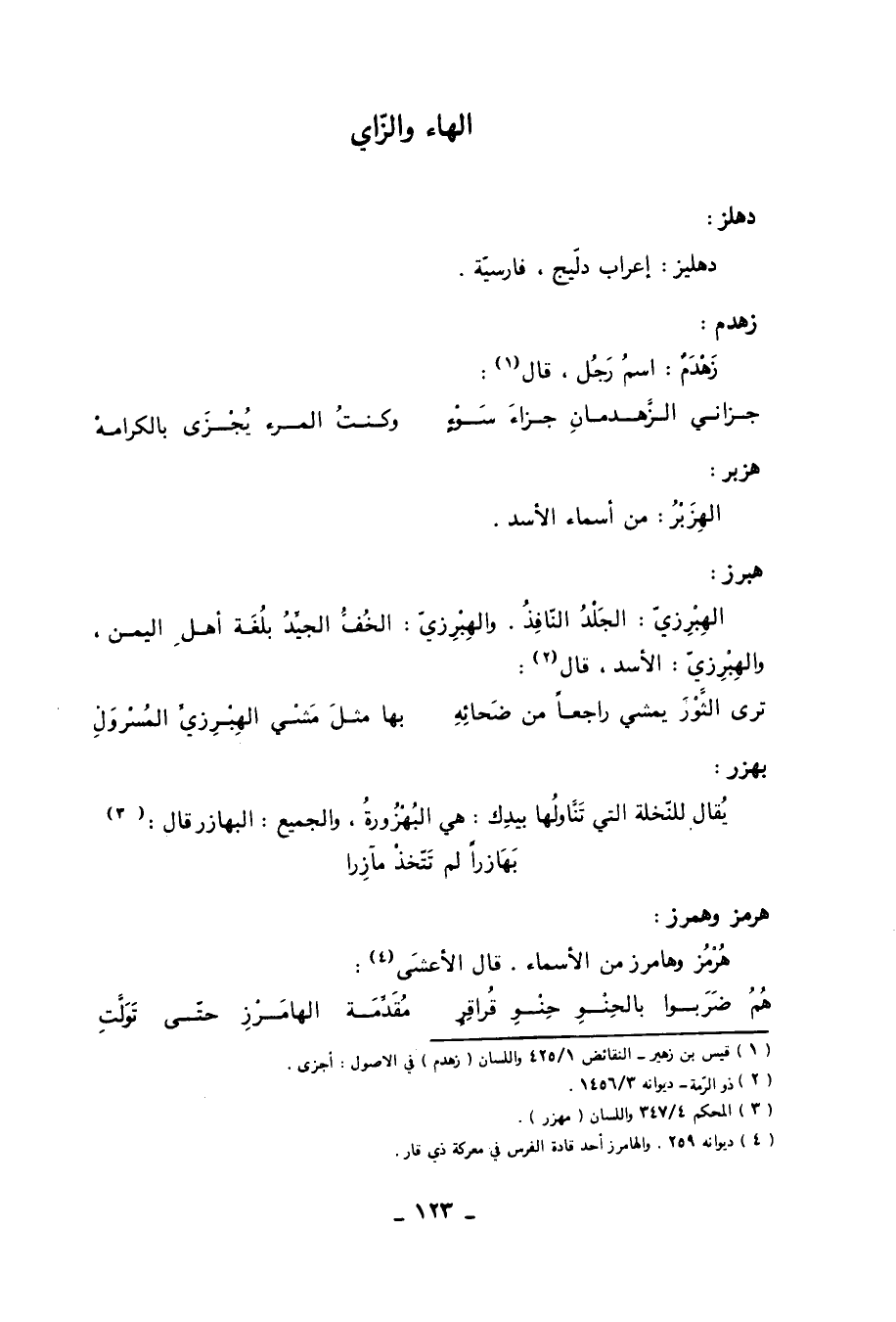 هبرز: الهِبْرِزيّ: الجَلْدُ النّاِفُذ. والهِبْرَزيّ: الخُفُّ الجيِّدُ بلُغَة أهلِ اليمن، والهِبْرِزيّ: الأٍسد، قال «2» :