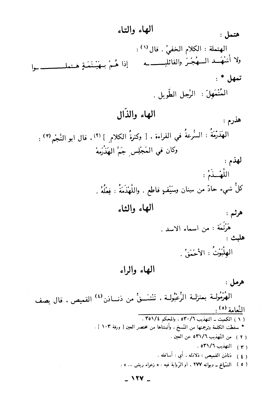 هذرم: الهَذرْمَةُ: السرعة في القراءة، [وكثرة الكلامِ] «3» ، قال أبو النجم «4» :