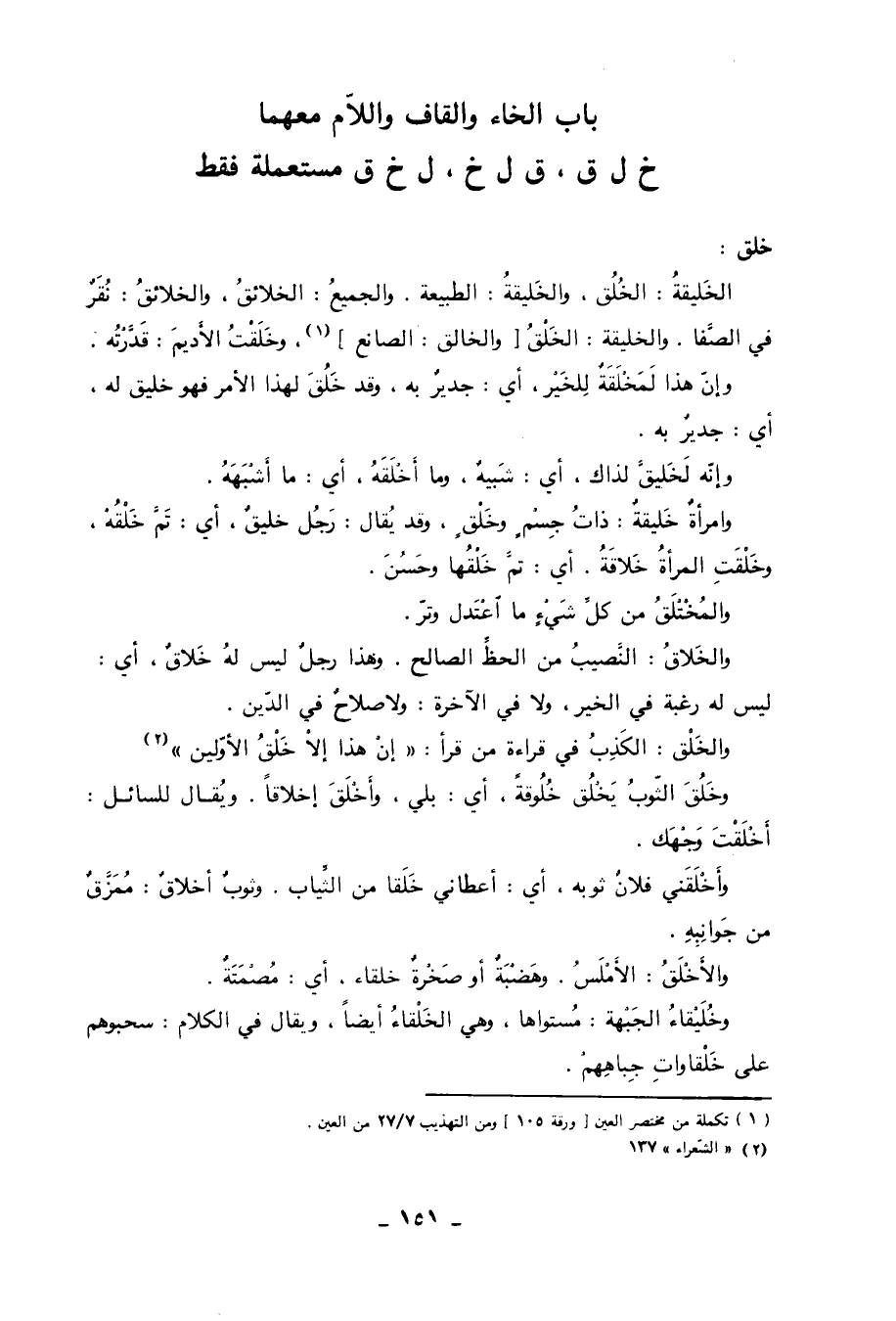 خلق: الخَليقةُ: الخُلُق، والخَليقةُ: الطبيعة. والجميع: الخلائقُ، والخلائقُ: نقر في الصفا. والخليقة: الخَلْقُ [والخالق: الصانع] «1» ، وخَلَقْتُ الأديم: قدرته. وإن هذا لَمَخْلَقَةٌ للخير، أي: جدير به، وقد خَلُقَ لهذا الأمر فهو خليق له، أي: جدير به. وإنه لَخَليقَّ لذاك، أي: شبيه، وما أخْلَقَهُ، أي: ما أشبهه. وامرأة خَليقةٌ: ذات جسمٍ وخَلْقٍ، وقد يقال: رجل خليق، أي: تم خَلْقُهْ، وخَلْقَتِ المرأة خَلاقَةُ. أي: تم خَلْقُها وحسن. والمُخْتْلَقُ من كل شيء ما اعتدل وتر. والخَلاقُ: النصيب من الحظ الصالح. وهذا رجل ليس له خَلاقٌ، أي: ليس له رغبة في الخير، ولا في الآخرة: ولا صلاح في الدين. والخَلْق: الكذب في قراءة من قرأ: إِنْ هذا إِلَّا خُلُقُ الْأَوَّلِينَ «2» وخَلُقَ الثوب يَخْلُق خُلُوقةً، أي: بلي، وأَخْلَقَ إخلاقاً. ويقال للسائل: أخَلَقْتَ وجْهَك. واخْلَقَني فلان ثوبه، أي: أعطاني خَلَقا من الثياب. وثوب أخلاقٌ: ممزق من جوانبه. والأخْلَقُ: الأَمْلَسُ. وهَضْبَةٌ أو صَخْرةٌ خلقاء، أي: مُصْمَتَةٌ. وخُلَيْقاءُ الجَبْهة: مُستواها، وهي الخَلْقاءُ أيضاً، ويقال في الكلام: سحبوهم على خلقاوات جباههم.