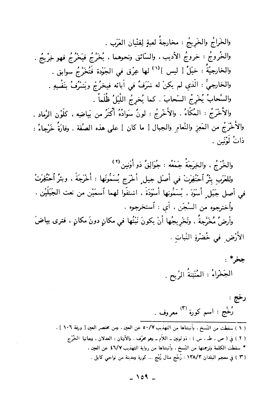 والخَراُج والخَرِيجُ: مخارجةُ لعبةٍ لفتيان العرب. والخُروجُ: خروجُ الأديب، والسائق ونحوهما، يُخَرَّجُ فيَخْرُجُ فهو خِرِّيجُ. والخارجيّةُ: خيل [ليس] «1» لها عرق في الجودة فتخرج سوابق. والخارجيُّ: الذي لم يكن له شرف في آبائه فيخرُجْ ويشرف بنفسه. والسحاب يُخْرِجُ السحاب. كما يُخرِجُ الليل ظلماً. والأَخْرَجُ: المكاء. والأَخْرجُ: لون سواده أكثر من بياضه، كلون الرماد. والأَخْرَجُ من المعز والنعام والجبال [ما كان] على هذه الصفة. وقارة خَرْجاءُ: ذات لونين. والخُرْجُ، والخِرَجَةُ جمعه: جُوَالِقٌ ذو أونين «2» وللعرب بئر احتفرت في أصل جيلٍ أَخْرَج يسمونها: أَخْرَجّةَ، وبئر احتفرت في أصل جبلٍ أسود، يسمونها أسودة، اشتقوا لهما اسمين من نعت الجبلين. واخترجوه من السجن، أي: استخرجوه. وأرض مُخَرَّجةٌ، وتَخْرِيجهُا أن يكون نَبْتُها في مكانٍ دون مكانٍ، فترى بياضَ الأرض في خضرة النباتِ.
