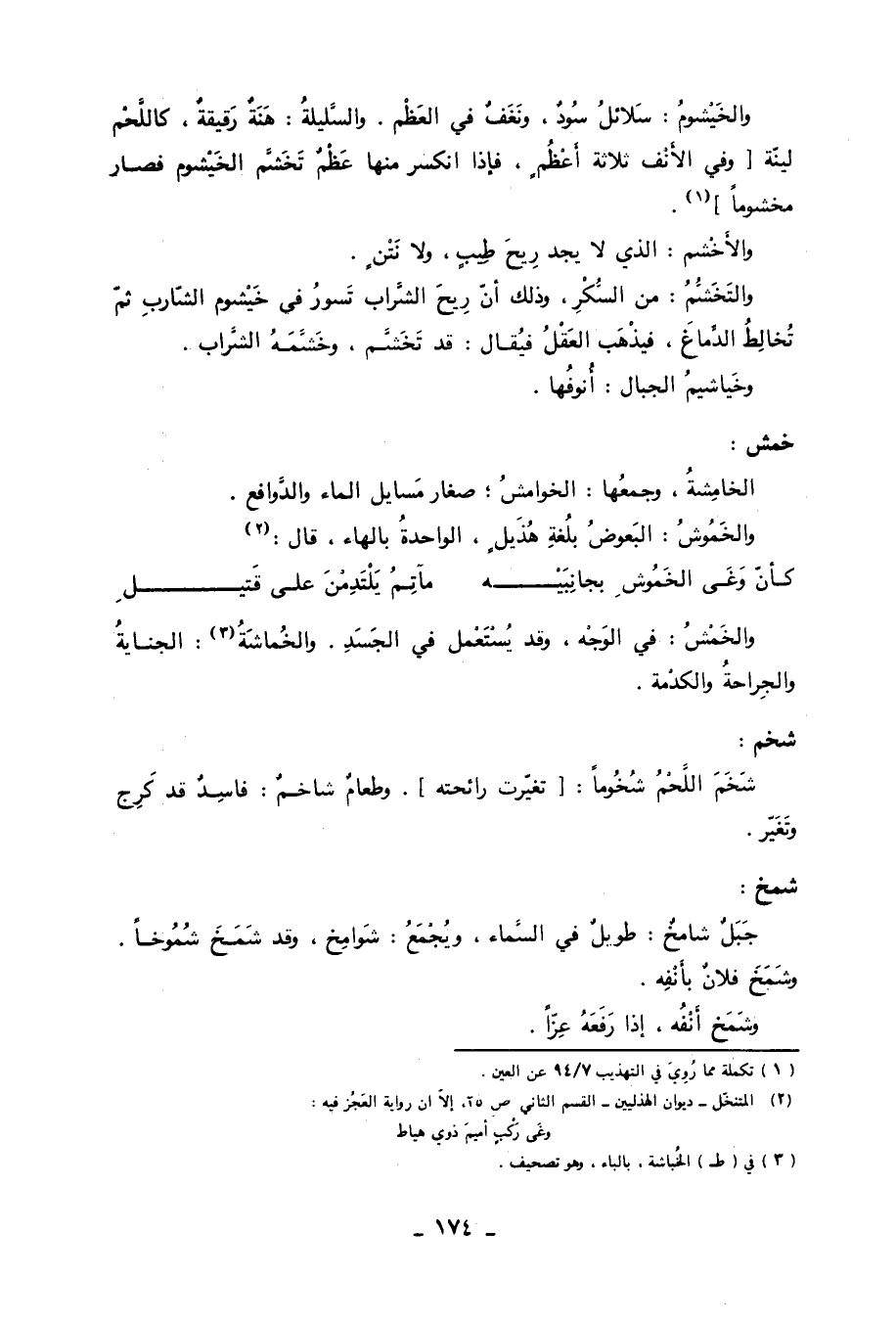 والخَيْشومُ: سَلائل سُودٌ، ونَغَفٌ في العظم. والسَّليلةُ: هَنَةٌ رَقيقةٌ، كاللَّحْم لينة [وفي الأنف ثلاثة أعظم، فإذا انكسر منها عظم تَخَشَّم الخَيْشوم فصار مخشوماً] «1» . والأخشم: الذي لا يجد ريح طيبٍ، ولا نتنٍ. والتَخَشُّمُ: من السكر، وذلك أن ريح الشراب تسور في خَيْشوم الشارب ثم تخالط الدماغ، فيذهب العقل فيقال: قد تَخَشَّم، وخَشَّمَهُ الشراب. وخَياشيم الجبال: أنوفها.