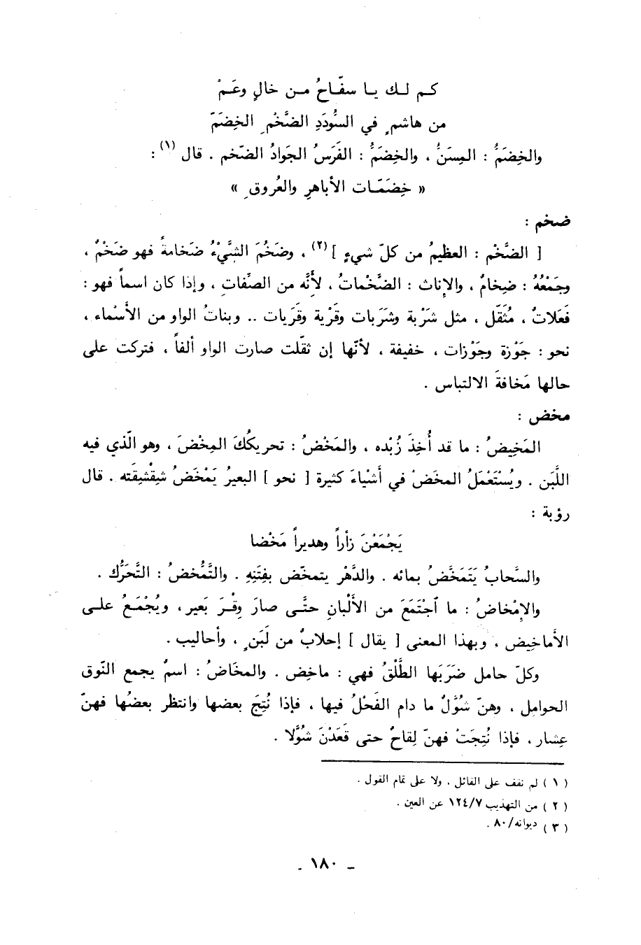 ضخم: [الضَّخْم: العظيم من كل شيء] «2» ، وضَخُمَ الشيء ضَخامةً فهو ضَخْمٌ، وجمعه: ضِخامٌ، والإناث: الضَّخْماتُ، لأنه من الصفات، وإذا كان اسماً فهو: فعلاتٌ، مثقل، مثل شربة وشربات وقرية وقريات.. وبنات الواو من الأسماء، نحو: جوزة وجوزات، خفيفة، لأنها إن ثقلت صارت الواو ألفا، فتركت على حالها مخافة الالتباس.