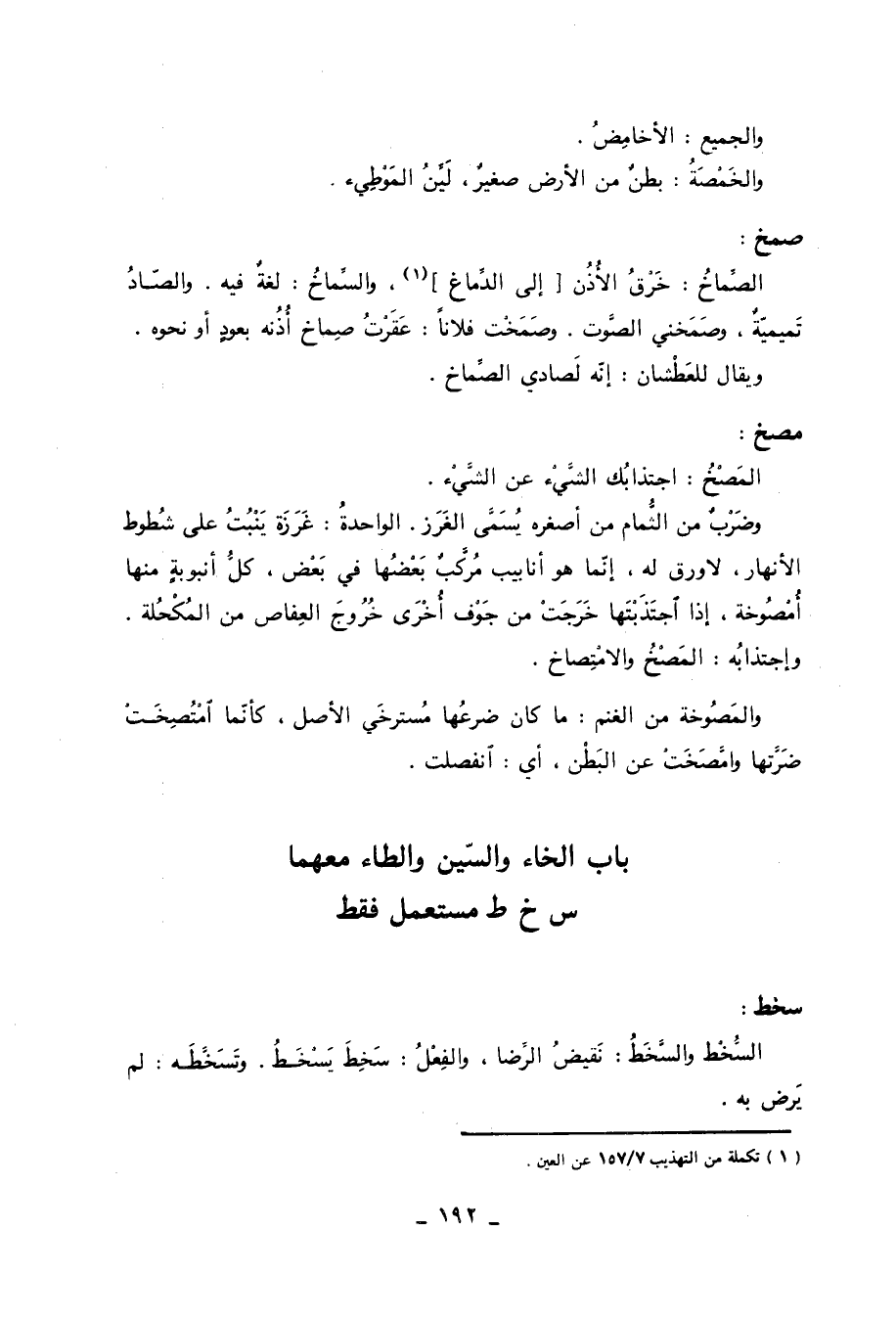 مصخ: المصخ: أجتذابك الشيء عن الشيء. وضربٌ من الثمام من أصغره يسمَّى الغَرَز. الواحدةُ: غرَزَة ينبتُ على شطوط الأنهار، لا ورق له، إنما هو أنابيب مركبٌ بعضُها في بعض، كل أنبوبةٍ منها أَمْصُوخة، إذا اجتذبتها خرجت من جوف أخرى خروج العفاص من المُكْحُلة. وإجتذابه: المصخ والامتصاخ. والمَصُوخة من الغنم: ما كان ضرعُها مُسترخَي الأصل، كأنما امْتُصِخَتْ ضرتها وامَّصَخَتْ عن البطن، أي: انفصلت.